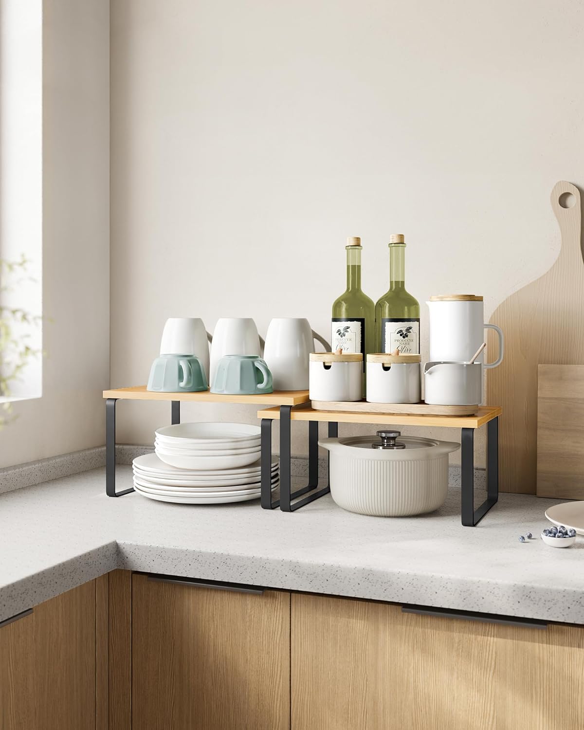 The SONGMICS Cabinet Organizer Shelf is the perfect solution for maximizing storage space in your kitchen. This set includes two counter shelves that are stackable and expandable, allowing you to customize your storage needs.